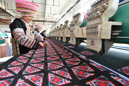 Women in Yangchuan Industrial Park, Suiyang county, Zunyi of southwest China’s Guizhou province make embroidery pieces, March 16, 2019. In recent years, the development of hand-embroidered products in the county has become a major measure for rural women to get rid of poverty. The traditionally pure manual work has been transformed into semi-mechanized and large-scale production, with a variety of new products popular in the market introduced, including embroidered medicine pillows, embroidered medicine pads, and sachets. (Photo from People’s Daily Online)