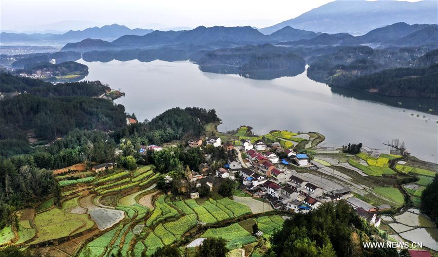 Aerial photo taken on March 18, 2019 shows the spring scenery at Hongsi Lake in Nanzheng District of Hanzhong City, northwest China's Shaanxi Province. Hanzhong received 52 million trips in 2018 and its booming tourism have brought more income to about 200,000 local people. (Xinhua/Tao Ming)