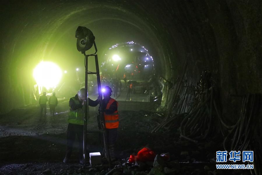 Workers construct the Daliangshan tunnel, March 21. (Photo/Xinhua)