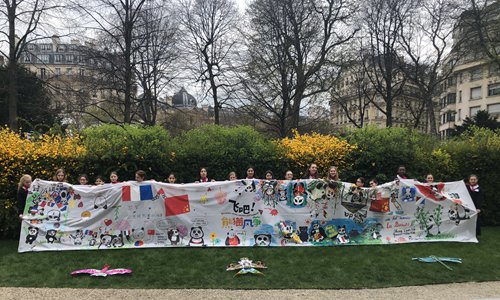 Students from China and France hold a huge mural featuring pandas and kites to advocate environmental protection at an event in Paris on Sunday. The event, including photo exhibits and films, was among a series of activities to mark the 55th anniversary of the establishment of China-France diplomatic ties. (Global Times/Cao Siqi)