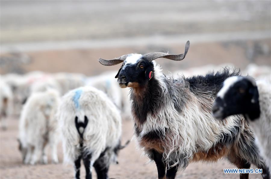 Photo taken on Jan. 17, 2019 shows sheep in Nagqu, southwest China's Tibet Autonomous Region. Tibet's 2018 GDP reached 147.76 billion yuan (22 billion U.S. dollars), about 191 times more than the 1959 figure calculated at comparable prices, said a white paper released Wednesday by China's State Council Information Office. Through 60 years of hard work, the people in Tibet have seen agriculture and animal husbandry become increasingly modernized, said the white paper, titled "Democratic Reform in Tibet -- Sixty Years On." (Xinhua/Chogo)