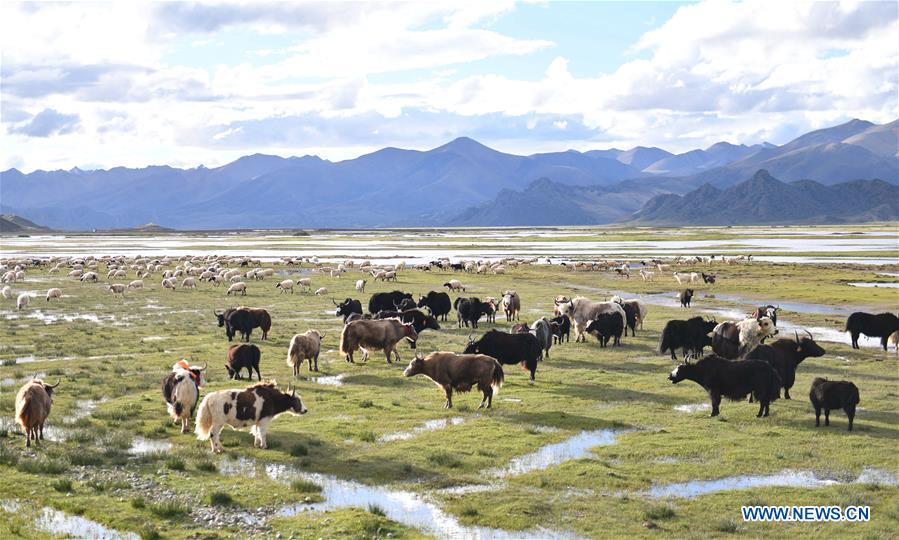 Photo taken on Aug. 27, 2017 shows cattle and sheep on the grassland in southwest China's Tibet Autonomous Region. Tibet's 2018 GDP reached 147.76 billion yuan (22 billion U.S. dollars), about 191 times more than the 1959 figure calculated at comparable prices, said a white paper released Wednesday by China's State Council Information Office. Through 60 years of hard work, the people in Tibet have seen agriculture and animal husbandry become increasingly modernized, said the white paper, titled "Democratic Reform in Tibet -- Sixty Years On." (Xinhua/Jigme Dorje)