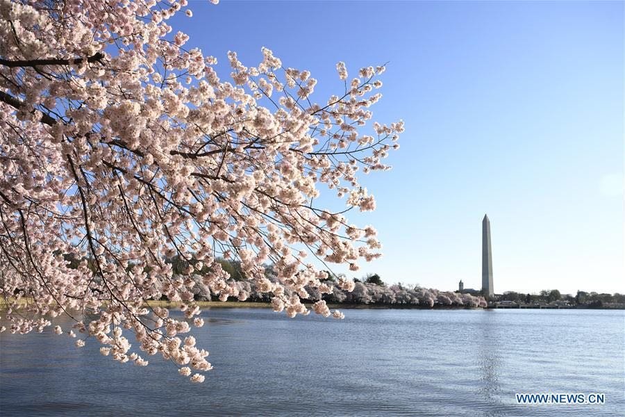 Cherry blossoms are seen around the Tidal Basin in Washington D.C., the United States, on April 1, 2019. The cherry blossoms reached peak bloom on Monday. (Xinhua/Liu Jie)