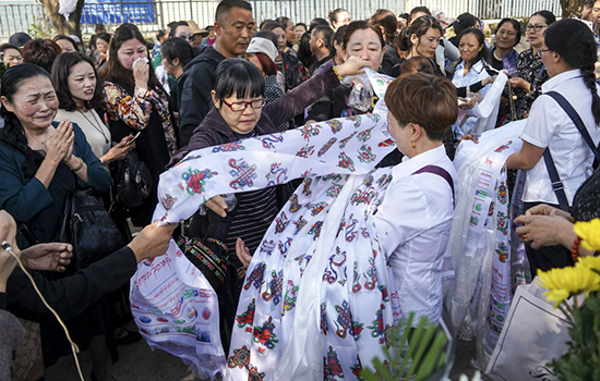 Residents take hada, white silk scarves that signify goodwill and purity, to a funeral home in Xichang, Sichuan province, on Tuesday to pay tribute to the 30 victims who died when fighting a recent forest fire in a nearby area. ZHANG CHAOQUN/XINHUA