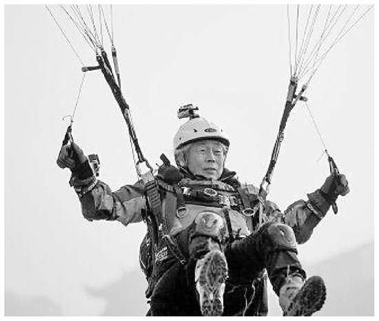 Huang Ruixiang, a 69-year-old man from Wenzhou, eastern China’s Zhejiang province, is another excellent senior paraglider.