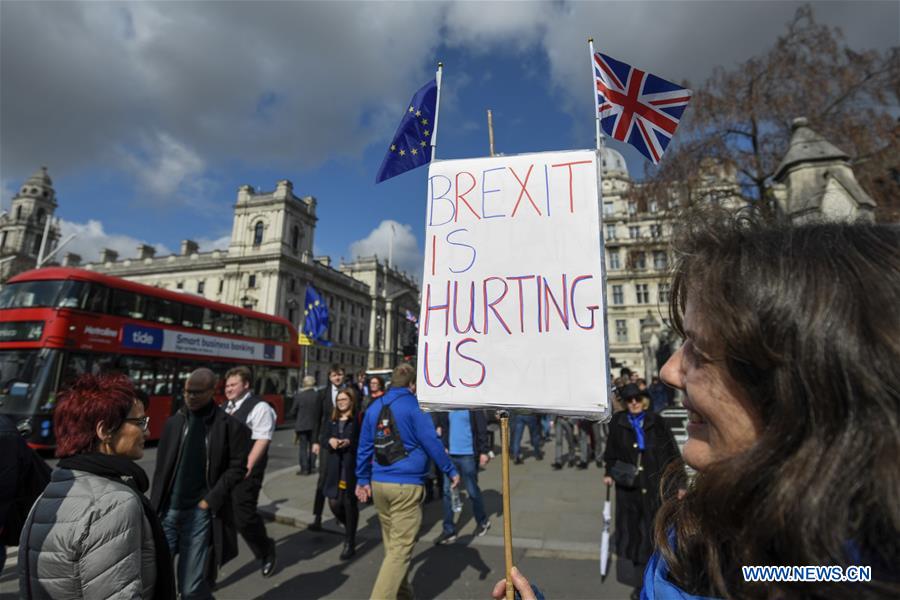 An anti-Brexit protester holds a placard outside the Houses of Parliament in London, Britain, on March 19, 2019.