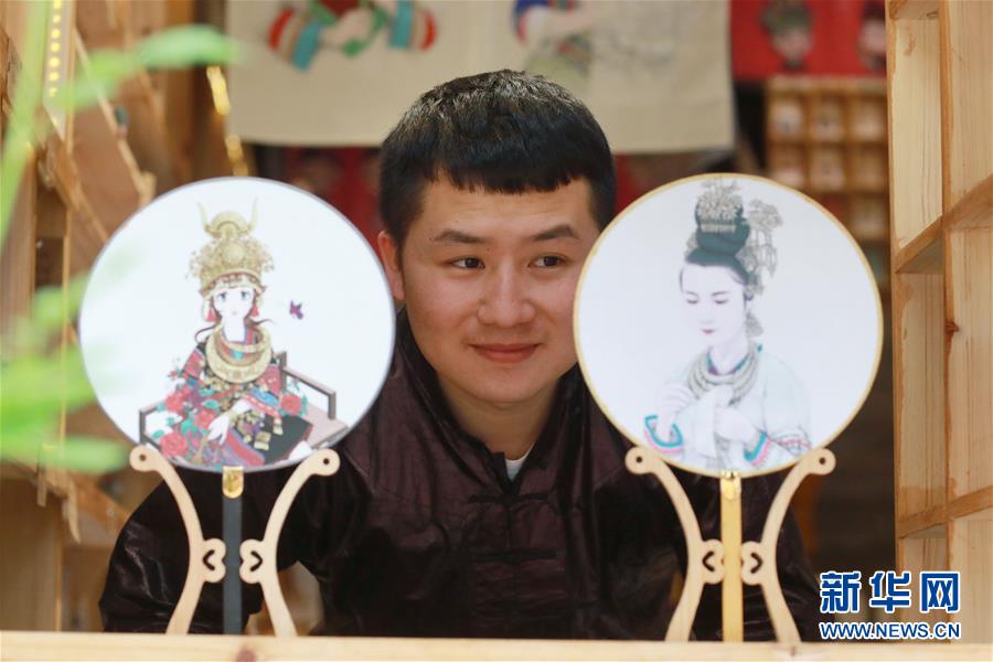 Lan Caisheng looks at fans printed with his illustrations, April 14. (Photo/Xinhua)