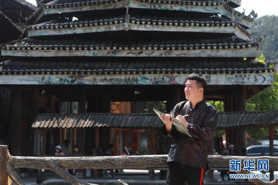 Lan Caisheng paints a Dong minority village in Zhaoxing, southwest China’s Guizhou province, April 14. (Photo/Xinhua)