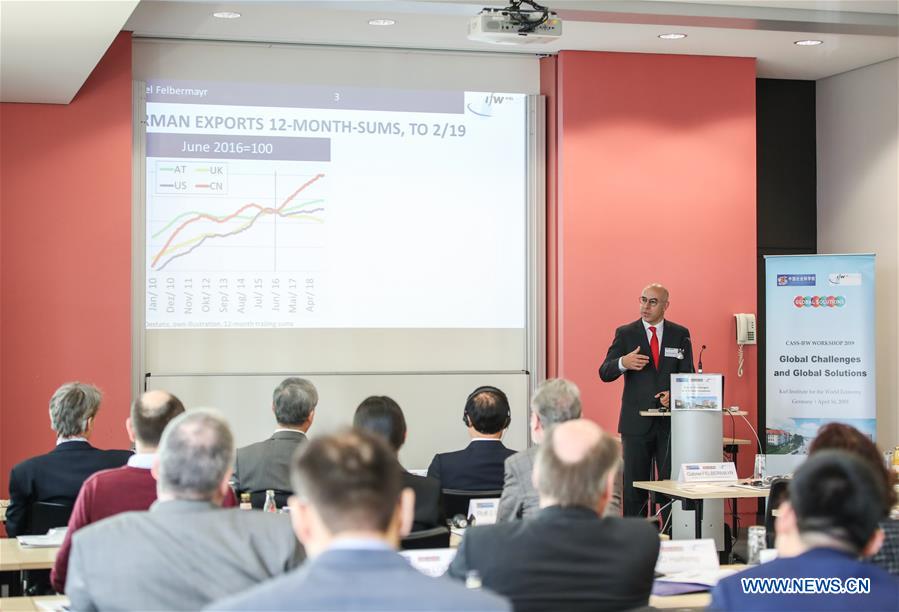 Gabriel Felbermayr (rear), President of the Kiel Institute for the World Economy (IfW), addresses a workshop titled "Global Challenges and Global Solutions" in Kiel, Germany, April 16, 2019. The workshop entitled "Global Challenges and Global Solutions" was held on Tuesday at Kiel, a famous harbor city in northern Germany. About 40 scholars from Chinese and German think tanks shared their research and opinions on a variety of topics such as the new industrialization process, the Belt and Road Initiative, global governance and 5G policy. (Xinhua/Shan Yuqi)