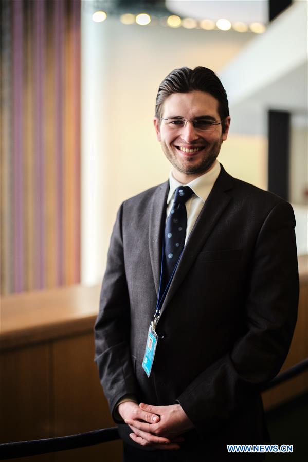 United Nations tour guide Oliver Marsh poses for a photo at the UN headquarters in New York, April 17, 2019. Oliver Marsh, a New Yorker, is a Chinese-speaking tour guide at the visitor center of the UN headquarters. In February, when Chinese visitors peaked at the UN headquarters during the Spring Festival holidays, Marsh started guiding Chinese language tours. He is now the only Chinese-speaking tour guide at the visitor center whose native language is not Chinese. (Xinhua/Li Muzi)