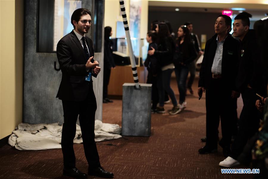 United Nations tour guide Oliver Marsh (L) speaks to tourists at the UN headquarters in New York, April 17, 2019. Oliver Marsh, a New Yorker, is a Chinese-speaking tour guide at the visitor center of the UN headquarters. In February, when Chinese visitors peaked at the UN headquarters during the Spring Festival holidays, Marsh started guiding Chinese language tours. He is now the only Chinese-speaking tour guide at the visitor center whose native language is not Chinese. (Xinhua/Li Muzi)