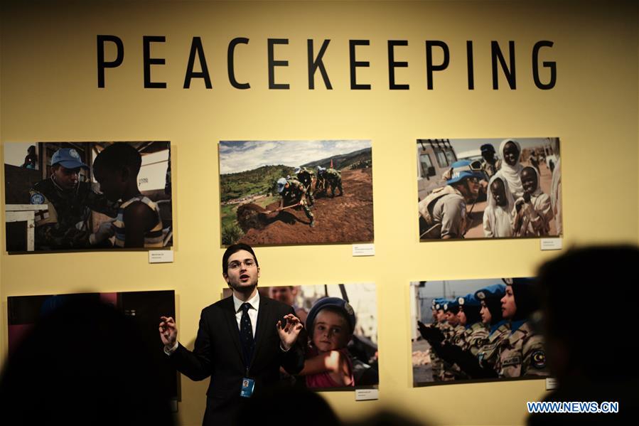 United Nations tour guide Oliver Marsh speaks to tourists at the UN headquarters in New York, April 17, 2019. Oliver Marsh, a New Yorker, is a Chinese-speaking tour guide at the visitor center of the UN headquarters. In February, when Chinese visitors peaked at the UN headquarters during the Spring Festival holidays, Marsh started guiding Chinese language tours. He is now the only Chinese-speaking tour guide at the visitor center whose native language is not Chinese. (Xinhua/Li Muzi)