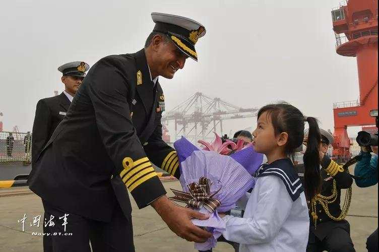 A child gives flowers to an Indian naval officer. (Photo/Navy.81.cn)