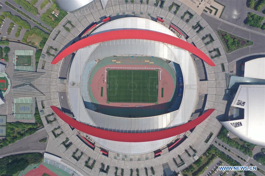 Aerial photo taken on April 19, 2019 shows the view of a stadium in Nanjing Olympic Center in Nanjing, capital of east China's Jiangsu Province. (Xinhua/Li Bo)
