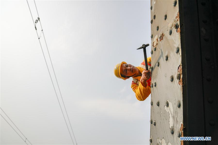 Tang Jinhua checks rust on the previous Baishatuo Yangtze River railway bridge in Jiangjin of southwest China's Chongqing Municipality, April 23, 2019. The previous Baishatuo Yangtze River railway bridge, completed in 1959, will stop service after April 24. All trains will run on the new double decker steel truss cable stay railway bridge after that day. The new bridge has 4 tracks on the upper deck for passenger trains with a designed speed of 200 kilometers per hour and 2 tracks on the lower deck for cargo trains with the designed speed of 120 kilometers per hour. (Xinhua/Liu Chan)