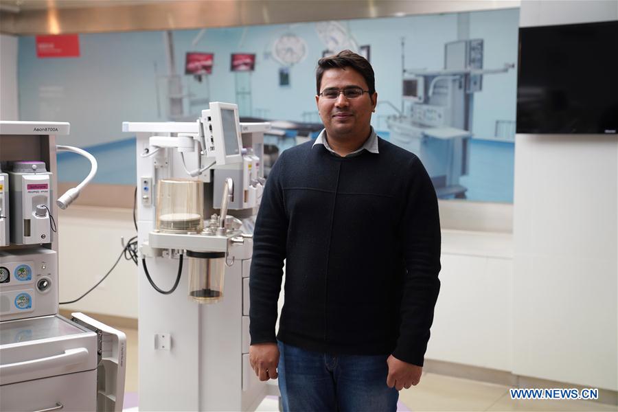 Mohsin Ahmad from Pakistan stands in the product demonstration room of Beijing AeonMed Co., Ltd. where he works in Beijing, capital of China, April 4, 2019. Mohsin Ahmad, 27, came to study mechanical engineering in Beijing Institute of Technology in 2016. He became an after-sales engineer in AeonMed, responsible for the product maintenance for Asian-Pacific region. He got married with an Indonesian girl he met in China. He plans to stay in China for 10 years and then return to Pakistan or Indonesia. With the proposal of Belt and Road Initiative, an increasing number of foreigners come to China to meet China and introduce China to the world. They are the link of the trade and cultural exchange of China and foreign countries. (Xinhua/Ju Huanzong)