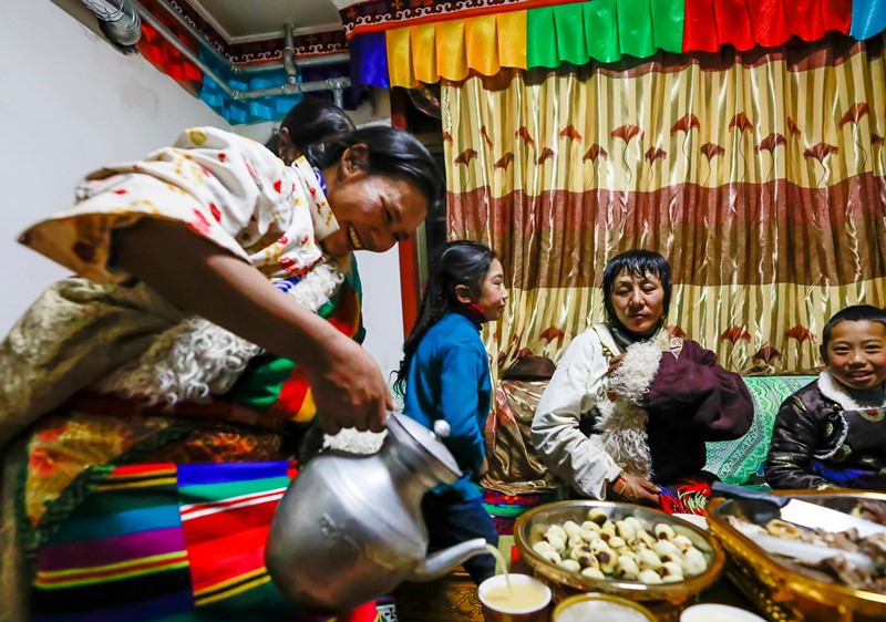 Family members eat “gutu”, a Tibetan staple food, on the eve of the Tibetan New Year, which fell on Feb. 3, 2019. It was their first family reunion after they were relocated to the new house in Ngari Prefecture, Tibet. (Photo by People’s Daily Online)