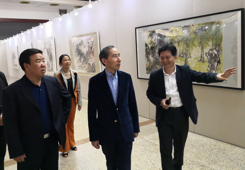 Lu Yixin (R) introduces his painting to Long Yuxiang (2nd R), executive chairman of the China International Cultural and Communication Center and other guests.