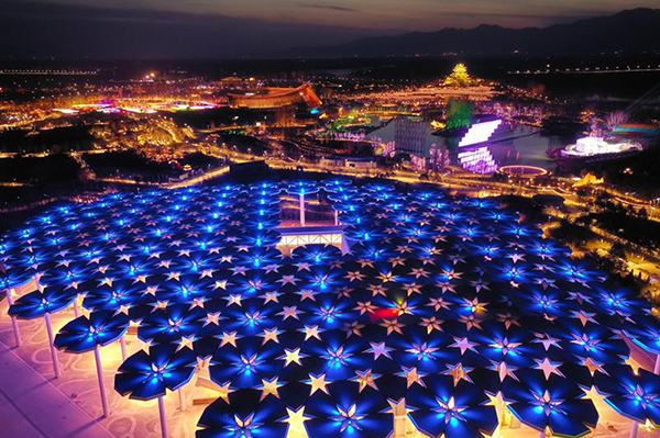 Photo shows the umbrella-shaped International Garden of the 2019 Beijing International Horticultural Exhibition in Yanqing district of Beijing. (People’s Daily/He Yong)