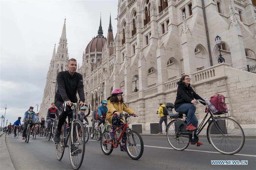 People participate in the "I Bike Budapest" event to promote bicycle as everyday transport in Budapest, Hungary, April 28, 2019. (Xinhua/Attila Volgyi)