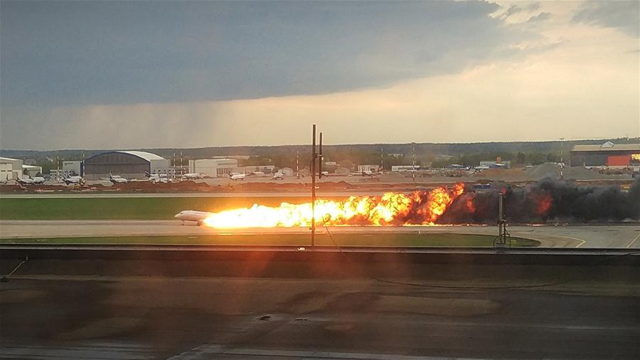 A passenger plane is seen on fire during its emergency landing in Sheremetyevo International Airport in Moscow, Russia, on May 5, 2019. Russia's Investigative Committee confirmed 37 survivors from 78 people aboard an SSJ-100 passenger plane en route to the northwestern Russian city of Murmansk that was on fire during an emergency landing in the Sheremetyevo International Airport in Moscow Sunday. (Xinhua/Sergei)