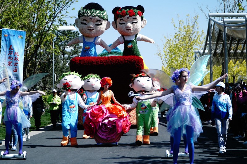 Decorated Float Parade welcomes tourists to the Beijing International Horticultural Exhibition received during the four-day International Workers' Day Holiday. (Photo by He Yong from People’s Daily)