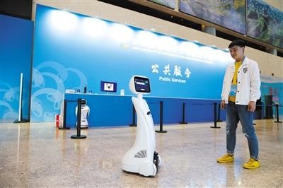 The robot “Amy” stands ready to offer guiding services. Photo by Hou Shaoqing, The Beijing News.