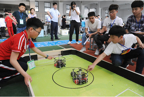 Photo shows students play robotic football at the third robot contest for primary and middle school students in Fuyang, east China’s Anhui province, May 12, 2019. (Photo/People’s Daily Online)