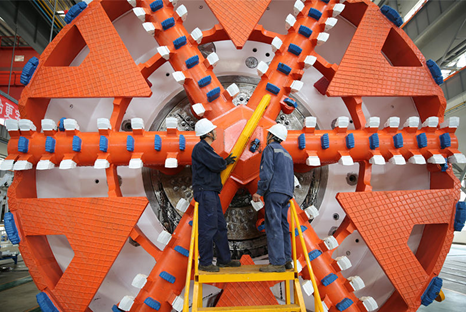 Workers of Jinan Heavy Machinery Joint-stock Co.,Ltd. check cutter blades of shield machines, May 11, 2019. The company is building an industrial park of smart manufacturing and high-end equipment specialized in rail transit. (Photo/People’s Daily Online)
