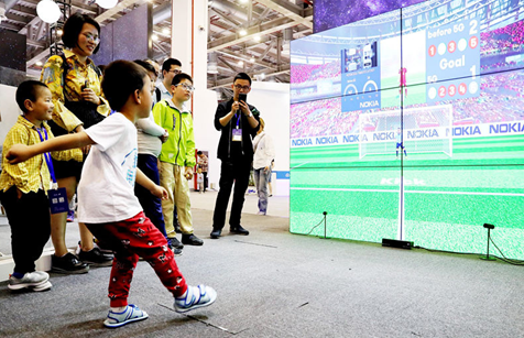 Achild experiences virtual penalty kickat 2019 Global AI Product Application Expo held at the Suzhou International Expo Center in east China’s Jiangsu province, May 11, 2019. (Photo/People’s Daily Online)