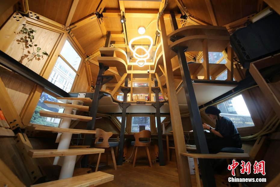 An inside view of a reading room that resembles a space capsule on a street in downtown Chongqing on May 27, 2019. More than 50 books are on display in the reading space, which is large enough to accommodate 10 people at one time. [Photo: Chinanews.com]