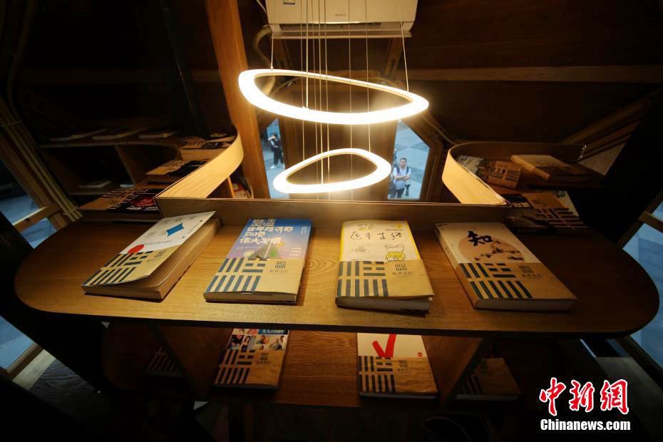 An inside view of a reading room that resembles a space capsule on a street in downtown Chongqing on May 27, 2019. More than 50 books are on display in the reading space, which is large enough to accommodate 10 people at one time. [Photo: Chinanews.com]