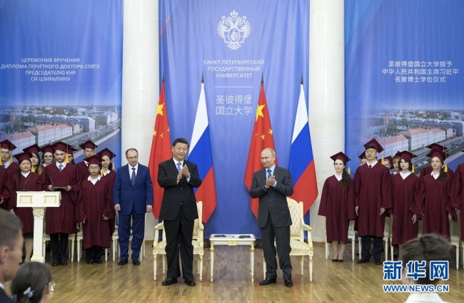 Their conferring of honorary doctorates on the heads of state of each other's countries testifies to the close educational and cultural exchanges between the two sides, and demonstrates the high level of China-Russia relations, Xi added.