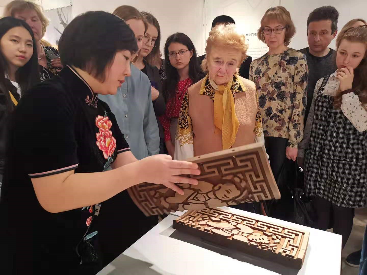 A Chinese woman is exhibiting traditional Chinese handicrafts to Russian visitors. (Wu Yan / People's Daily)