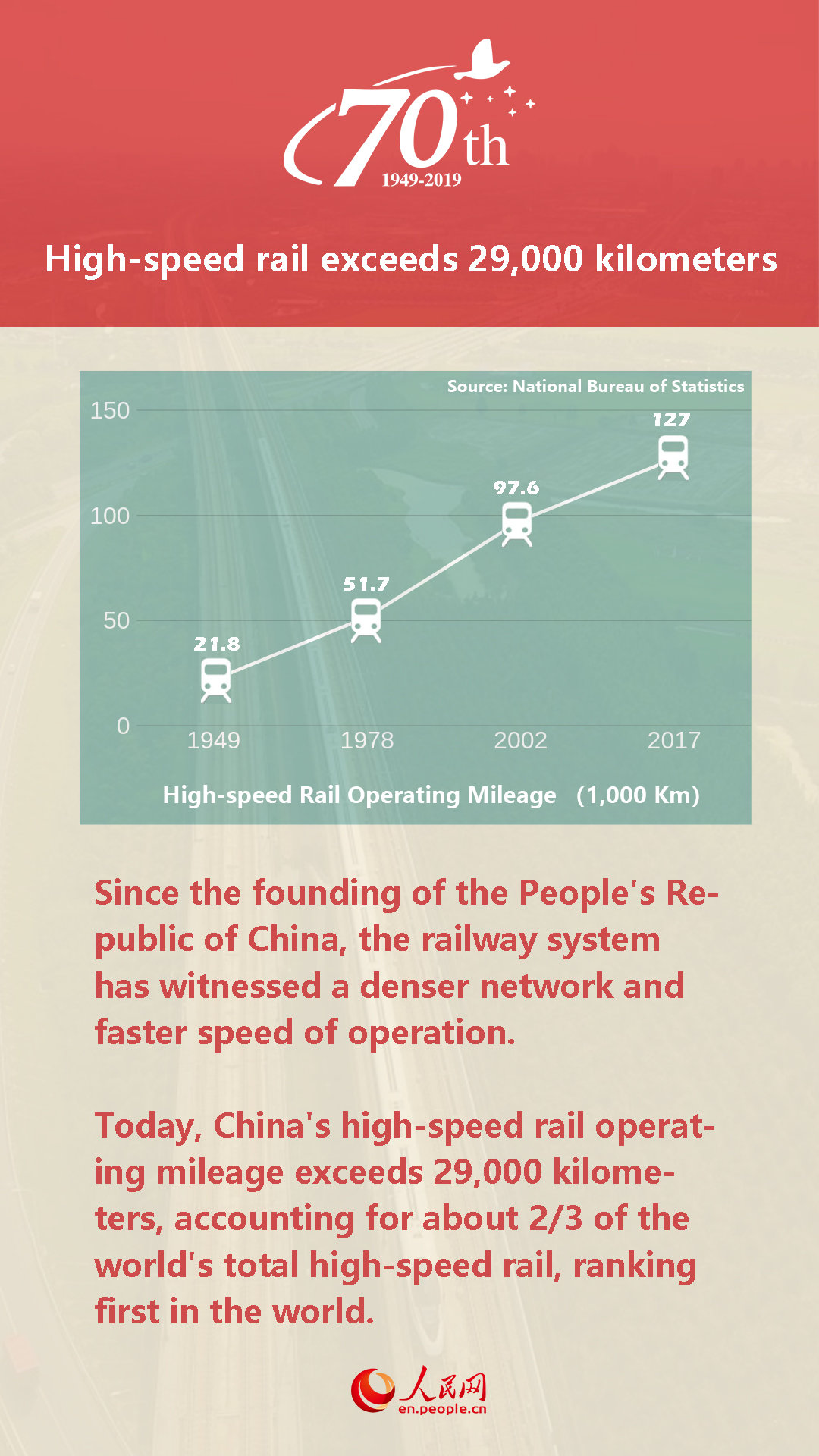 Since the founding of the People's Republic of China, the railway system has witnessed a denser network and faster speed of operation. Today, China's high-speed rail operating mileage exceeds 29,000 kilometers, accounting for about 2/3 of the world's total high-speed rail, ranking first in the world.