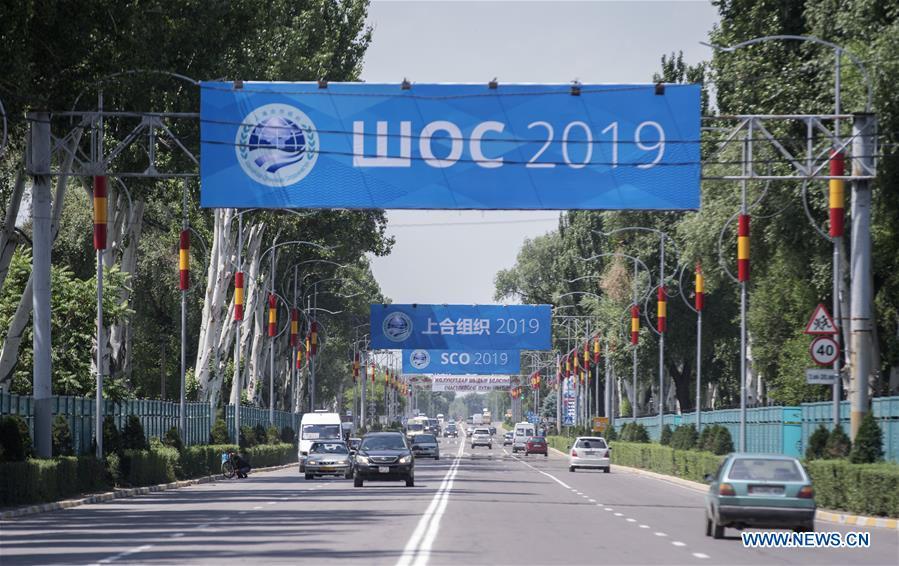 Photo taken on June 9, 2019 shows banners for Shanghai Cooperation Organization (SCO) meeting on a street in Bishkek, capital of Kyrgyzstan. (Xinhua/Fei Maohua)