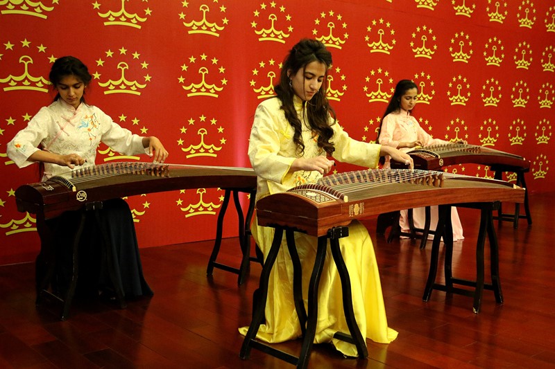 Students of Confucius Institute at Tajikistan Nationality University perform traditional Chinese instrument guzheng. Photo by Chen Shangwen, People’s Daily