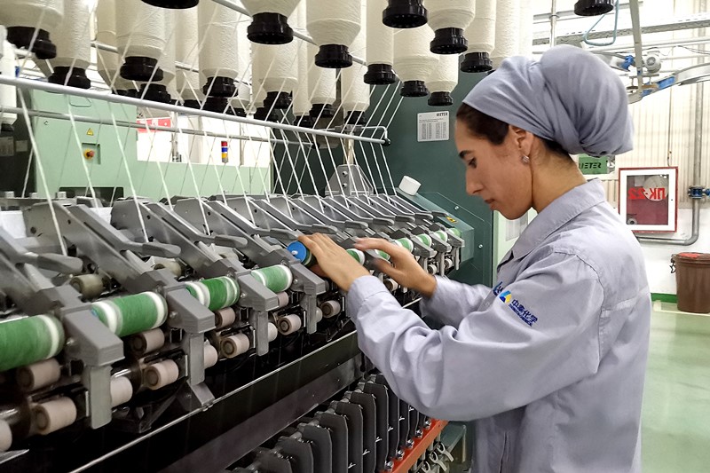 A Tajik worker is spinning at a workshop of a textile agricultural industry park built by China’s Zhongtai Group. Photo by Chen Shangwen, People’s Daily