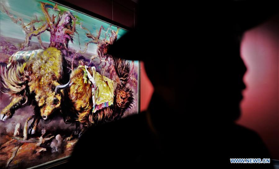 Wu Yuchu visits a yak-themed oil painting exhibition at the Yak Museum in Lhasa, capital of southwest China's Tibet Autonomous Region, May 14, 2019. (Xinhua/Purbu Zhaxi)