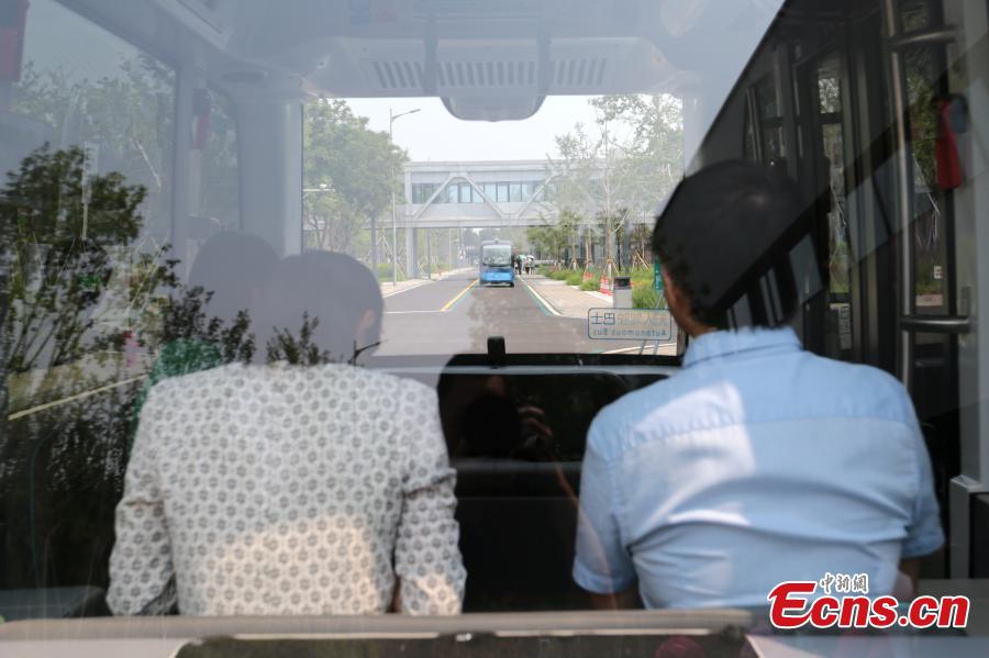 Photo shows an autonomous electric bus at the Xiongan public service center in Xiongan New Area, North China's Hebei Province, June 26, 2019. (Photo/China News Service)