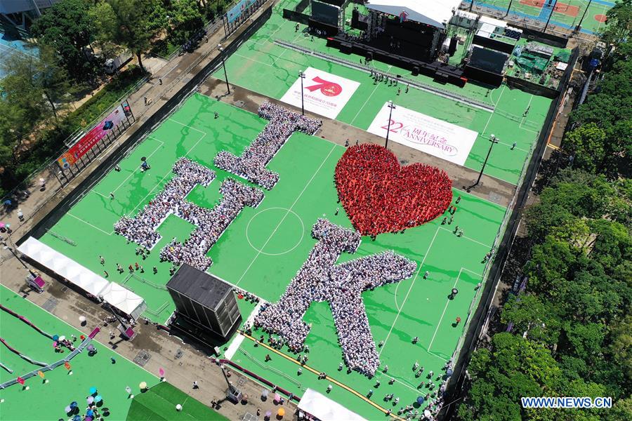 Aerial photo taken on July 1, 2019 shows a formation which spells out the words "I LOVE HK" to celebrate the 22nd birthday of the Hong Kong Special Administrative Region (HKSAR) in south China's Hong Kong. About 5,000 people gathered at Victoria Park in Hong Kong on Monday and stood in the formation spelling out words "I LOVE HK" to celebrate the 22nd birthday of the Hong Kong Special Administrative Region (HKSAR). (Xinhua/Lui Siu Wai)