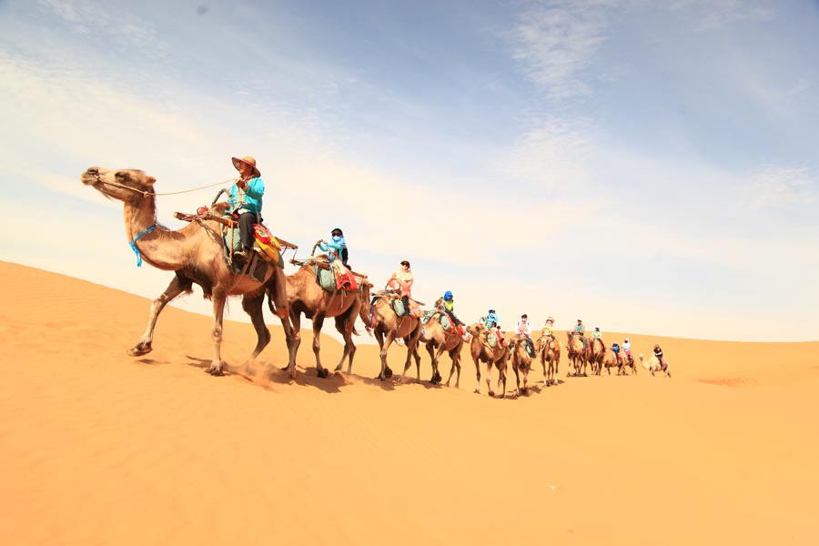 Children ride on camels on the Tengger Desert in Zhongwei in the Ningxia Hui autonomous region during a previous summer vacation. [Photo provided to China Daily]