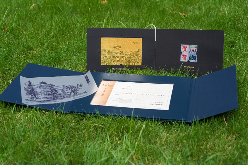 When you open the case, the anthem of Southeast University automatically plays. Souvenirs include a printed emblem of the university, a campus card, a souvenir card, and a set of customized commemorative stamps.