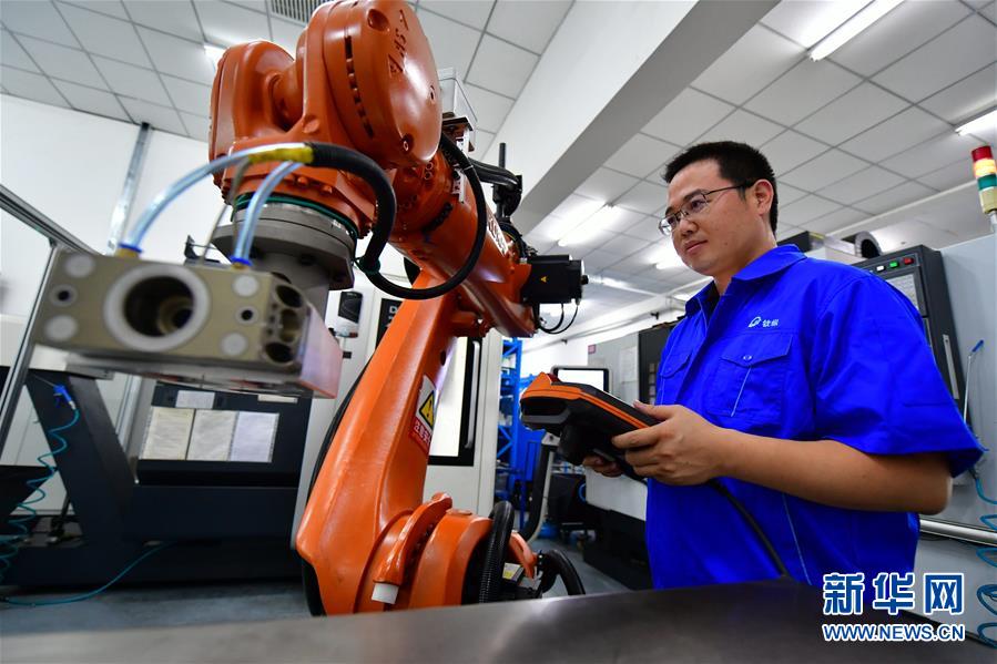 A worker operates a robot in a company producing electric mechanical products in Langfang, Hebei province. (Photo/Xinhua)