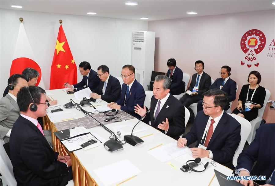 When meeting with Kono on the sidelines of the Association of Southeast Asian Nations (ASEAN) foreign ministers' meeting and other related meetings, Wang said China is ready to implement the important consensus reached by leaders of both countries at the Group of 20 (G20) Osaka Summit to ensure the stable and healthy development of China-Japan relations on the right track.