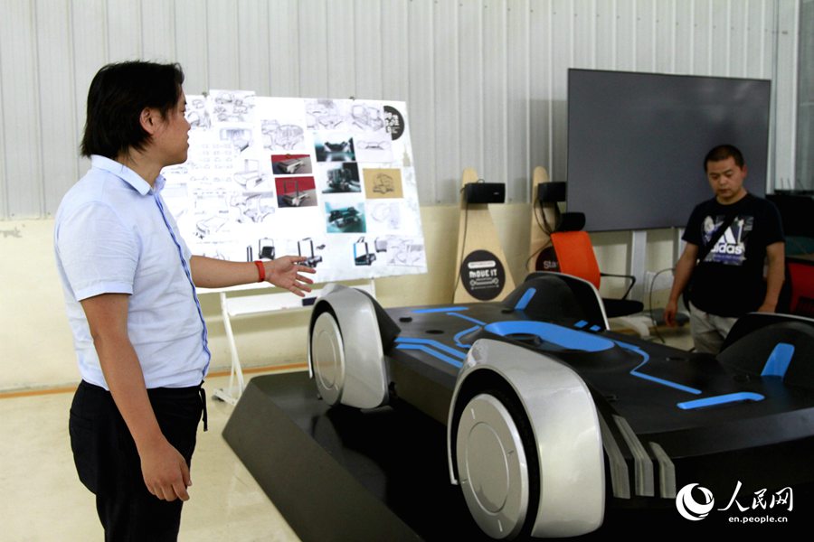 YuChuan, CEO of PIX Moving, introduces self-developed modular L4 universal autonomous chassis to visitors on July 28, 2019, in Guiyang High-tech Industrial Development Zone, southwest China's Guizhou Province. (People's Daily Online/Yasef)