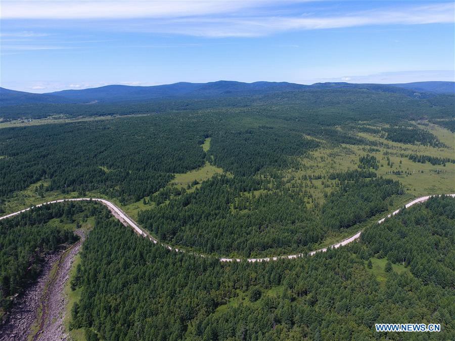 Aerial photo taken on Aug. 14, 2019 shows a walkway at Arxan National Forest Park in Arxan City, north China's Inner Mongolia Autonomous Region. (Xinhua/Liu Lei)