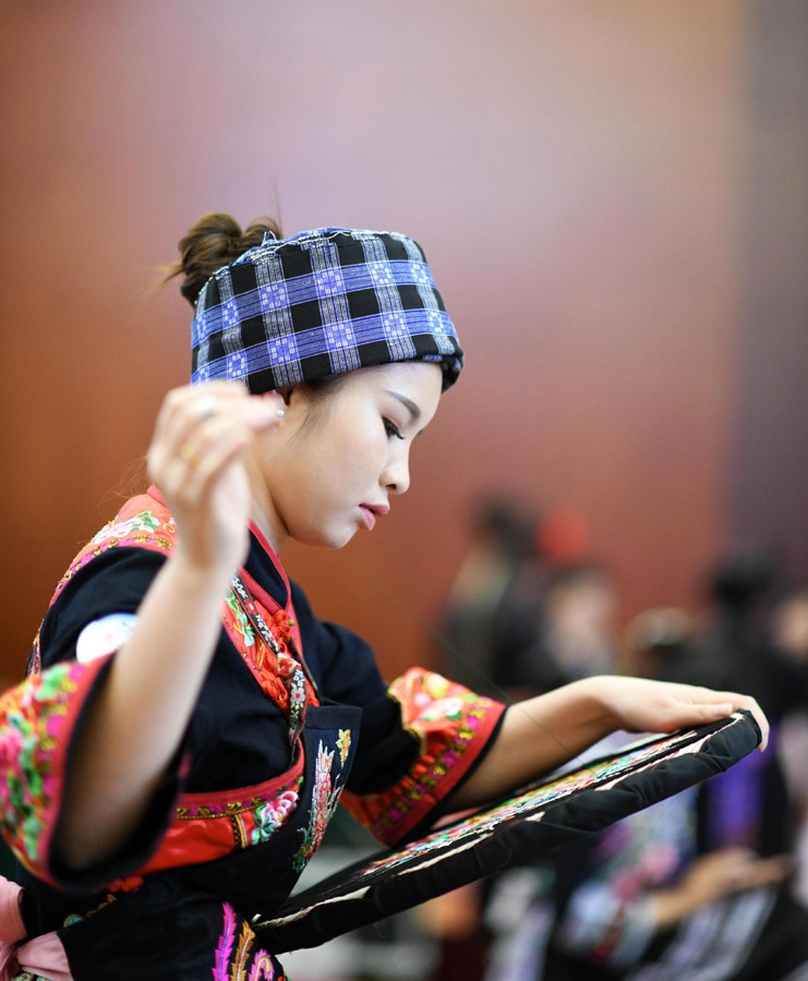A craftswoman embroids at the competition in Guiyang, Southwest China's Guizhou province, on Aug 14. (Photo/Xinhua)