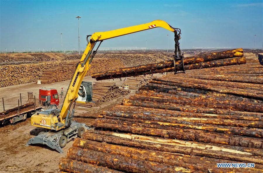 Aerial photo taken on Aug. 27, 2019 shows a wood storage yard at Wenfeng port in the China (Hebei) Pilot Free Trade Zone Caofeidian area in north China's Hebei Province. China (Hebei) Pilot Free Trade Zone (FTZ) Caofeidian area announced its inauguration on Saturday. Caofeidian area of the Hebei pilot FTZ focuses on industries including international commodity trade, port service, energy reserve and distribution, and high-end equipment manufacturing. (Xinhua/Yang Shiyao)