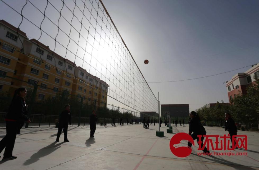 Trainees play volleyball in the vocational education and training center in Yutian county, Xinjiang. (Photo/huanqiu.com)